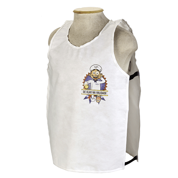 Avental em TNT branco com dois elásticos nas laterais e acabamento com viés.