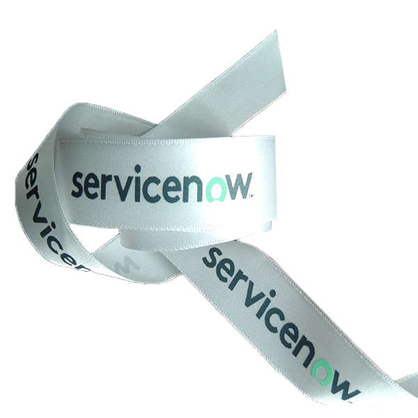 Fita de cetim branco, personalizada em face simples com o logo Servicenow.