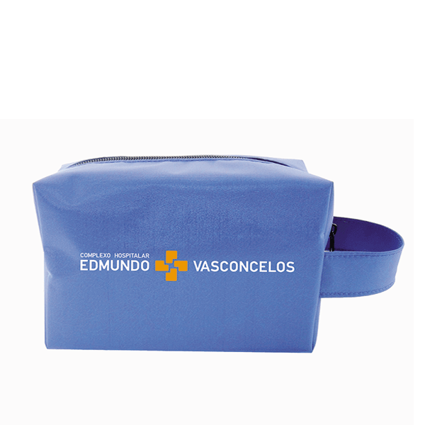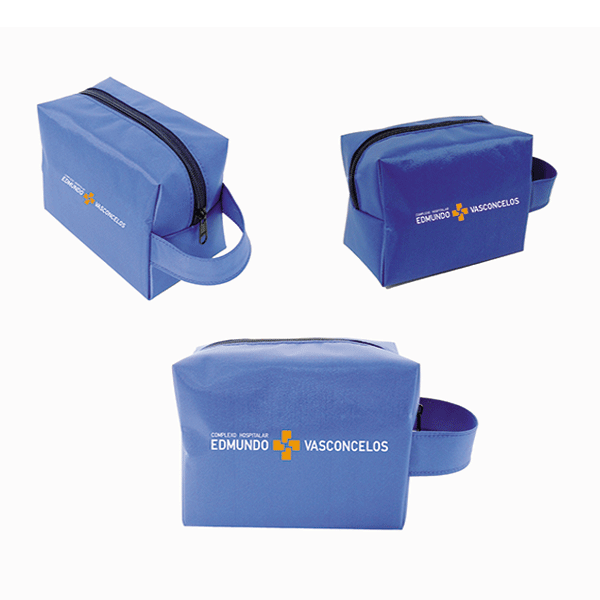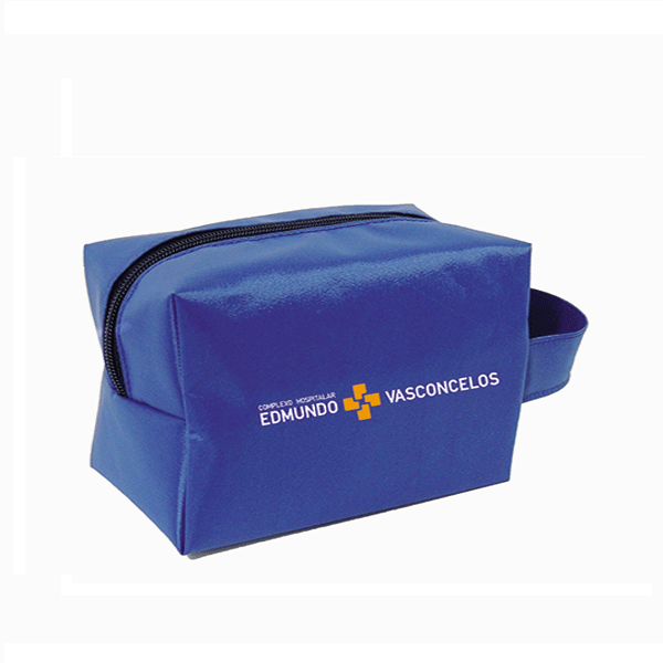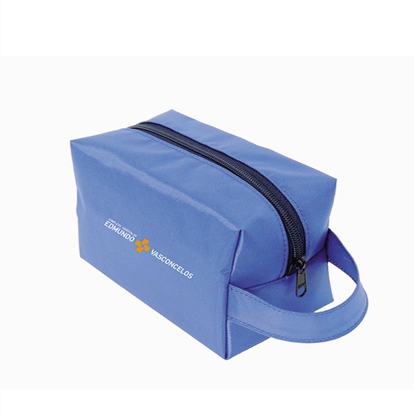 Necessaire em nylon plastificado, fechamento com zíper e alça lateral.