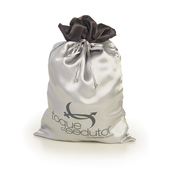 Saquinho de cetim que contém uma barra dupla com variação de cores, fechamento em fita de cetim e ponteiras.