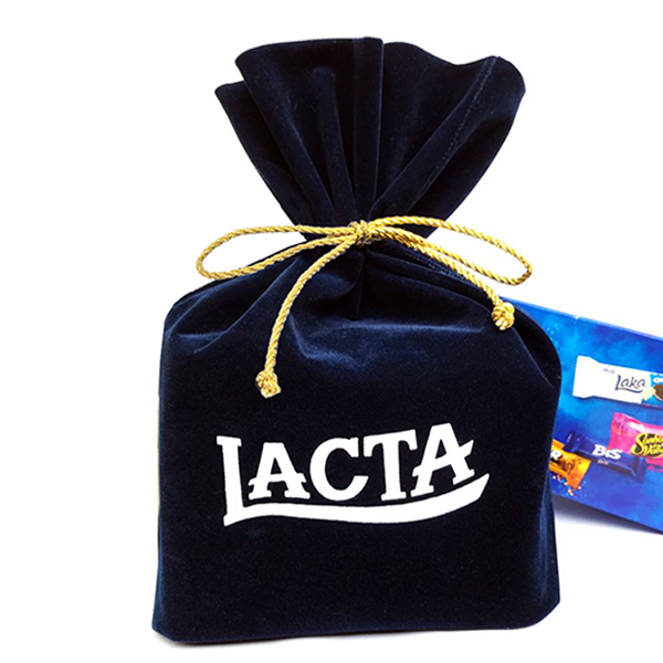 Saco de veludo azul marinho com barra dupla e cordão de São Francisco solto. Maneira perfeita de presentear alguém enquanto divulga sua marca com elegância e estilo.
